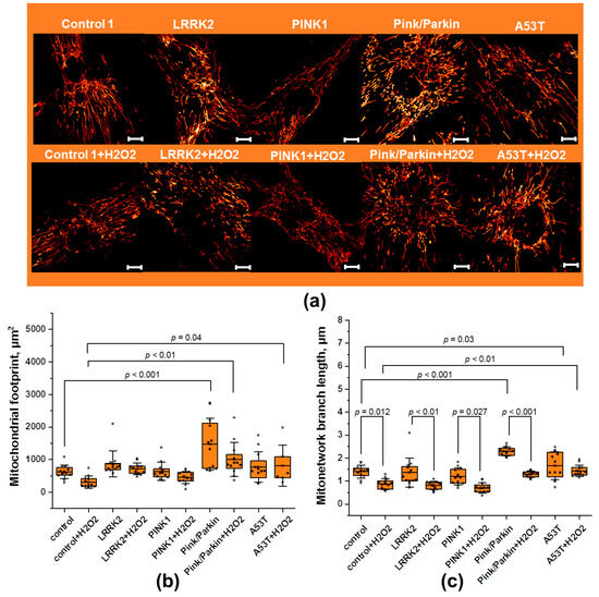 Next, we evaluated the length of mitochondria (Figure 3c) in the MN (mitochondrial branch length). The mitochondrial branch length can be an important parameter showing the adaptation of the cell to substrate deprivation and stress, and it may change in pathology. As mentioned above, an MN is considered to be a structure containing strictly more than one branch and a non-zero connection. The mitochondrial branch lengths were higher in fibroblasts with Pink/Parkin (2.28 ± 0.19 μm) and A53T (1.66 ± 0.6 μm) mutations compared to the control (1.41 ± 0.27 μm) as well as other mutated fibroblasts (LRRK2—1.37 ± 0.63 μm; PINK1—1.19 ± 0.36 μm). As expected, hydrogen peroxide addition activated mitochondrial fission, leading to a significant decrease in mitochondrial branch length across almost all fibroblasts except A53T. The coefficients of mitochondrial length reduction are as follows: control—1.60; LRRK2—1.65; PINK1—1.70; Pink/Parkin—1.79.