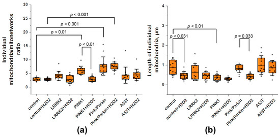 The ratio and length of individual mitochondria in fibroblasts of patients with Parkinson’s disease and established mutations and healthy individuals. (a) The ratio of individual mitochondria to mitochondrial networks (MNs) under normal conditions and after hydrogen peroxide (150 µM for 1 h) stress. MN is considered to be a structure containing strictly more than one branch and a non-zero connection, whereas individual mitochondria contain only one branch and zero junction. (b) The median length of individual mitochondria before and after treatment with hydrogen peroxide (150 µM for 1 h) stress. n = 12 cells in 3 independent experiments. Box plots show median and interquartile range, and dots represent individual data points. Statistical significance for control and mutated fibroblasts was determined using one-way ANOVA with Tukey’s multiple comparison test. The Bonferroni correction was used to adjust the significance level for multiple comparisons (adjusted p-value = 0.005). Statistical significance for cell lines before and after exposure to peroxide was performed using an unpaired Student’s t-test (p-value < 0.05).