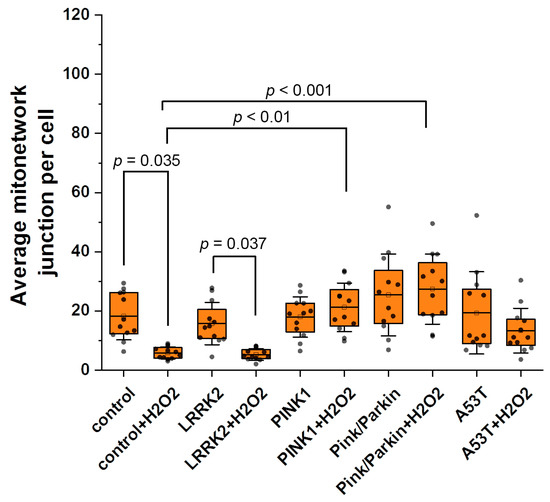 Furthermore, we evaluated the MN connectivity (Figure 5) by calculating the average number of junctions in the MN per cell. A change in mitochondrial connectivity may indicate cell adaptation to decreased substrate supply, a violation of bioenergetics and mitochondrial fission/fusion. Under normal conditions, the average number of junctions in the MN for all cell lines does not differ significantly (control—18.2 ± 7.5; LRRK2—15.6 ± 7.1; PINK1—17.9 ± 6.8; A53T—19.3 ± 13.9; Pink/Parkin—25.4 ± 13.8). When hydrogen peroxide is added, the average number of junctions in the MN decreases for control cells and fibroblasts with LRRK2 mutation significantly (the reduction coefficient for control is 3.13; for LRRK2—2.1), whereas in cells with PINK1, Pink/Parkin, and A53T mutations, connectivity does not change and is significantly higher than in control cells (for PINK1 by 3.7 times and Pink/Parkin by 4.6 times).