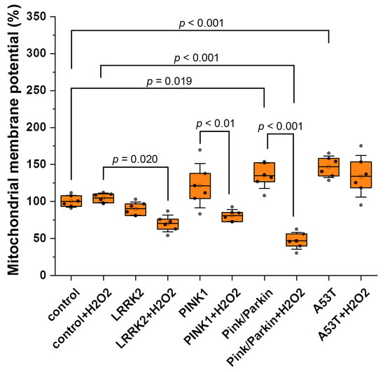 The maintenance of the mitochondrial potential is necessary for efficient ATP synthesis, while changes in the mitochondrial membrane potential may indicate possible impairment of mitochondrial function. We evaluated the values of the mitochondrial potential using a potential-sensitive probe, TMRM (Figure 6). It was found that the mitochondrial membrane is significantly hyperpolarized in fibroblasts with Pink/Parkin (137.6 ± 21.2%) and A53T (154.5 ± 10.4%) mutations relative to the control (100%). After hydrogen peroxide-induced stress (150 μM, 30 min), there is significant decrease in mitochondrial membrane potential in fibroblasts with PINK1 (by 34.8 ± 8.3) and Pink/Parkin (by 90.7 ± 7.5) mutations, while in cells with the A53T mutation, the mitochondrial membrane potential remains hyperpolarized.