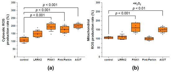 We measured the rate of cytosolic ROS production under normal conditions using the time kinetics of DCF fluorescence (chemically reduced and acetylated forms of 2′,7′-dichlorofluorescein H2DCFDA probe) and calculated the rate as a differential (Figure 7a). A significant increase in the rate of ROS production was found almost for all fibroblasts with mutations: PINK1 by 1.9 times (191.5 ± 36.6%), Pink/Parkin by 1.8 times (180.3 ± 31.1%), and 1.9 times (199.4 ± 21.4%) in A53T relative to the control taken as 100% (with the exception of the LRRK2 mutation fibroblast, where only a trend was observed).