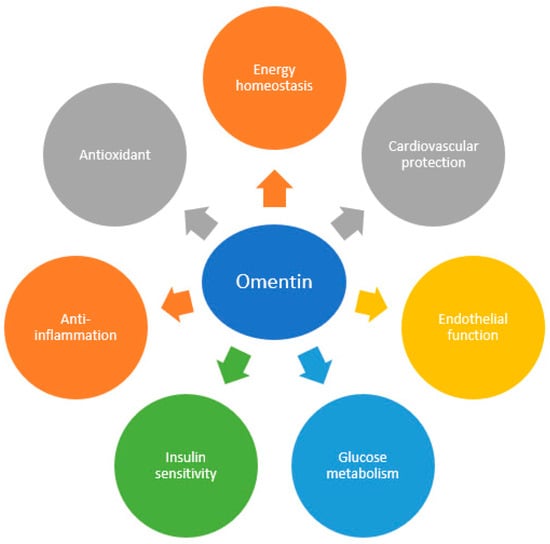 The ability that Omentin-1 has to promote vasodilation, reduce inflammation, and protect endothelial cells may contribute to its potential anti-atherogenic properties [28,33]. Indeed, omentin-1 has anti-inflammatory, antioxidant, and anti-apoptotic properties, positively impacting endothelial function and preventing atherosclerosis [7,33,34,35].