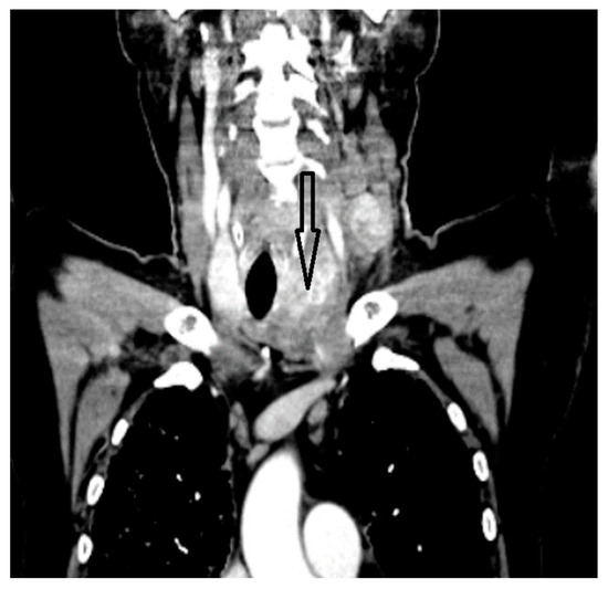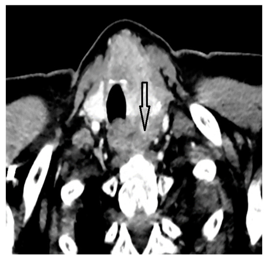 Mucoepidermoid carcinoma (MEC) is the most common type of malignant salivary gland tumor, accounting for 10–15% of all salivary gland neoplasms, with a mean age of onset of 55 years and a slight female to male prevalence [3]. Other sites of origin for MECs include the gastrointestinal tract, the pancreas, and the breast tissue [4,5,6,7]. Rarely, primary MEC may arise from the thyroid gland, with a total of approximately 50 cases being reported to date and the disease being first described in 1977 by Ratigan et al. [8]. Histologically, primary thyroid MEC is defined by a mixture of malignant epidermal and mucin-secreting cells [9,10] which may have periodic acid–Schiff-positive intracytoplasmic inclusions, and it may be associated with chronic lymphocytic thyroiditis or concurrent papillary thyroid carcinoma [11,12].