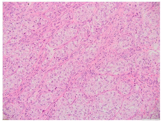 Thyroid MEC metastasis HE 20×. Oval, round, and polygonal cells arranged in a nest-like and islet-like growth pattern. Scale bar 100 µm.
