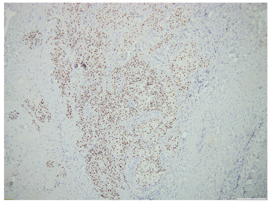 Following an assessment of the case as a multidisciplinary team, the patient was referred to the Surgery Department, where an excisional biopsy was performed from one of the left laterocervical adenopathies (a tissular fragment of 13/12/10 mm). Histological examination showed malignant infiltration with oval, round, and polygonal medium-sized cells arranged in a nest-like and islet-like growth pattern, findings consistent with metastasis. In order to establish the origin of malignancy, immunohistochemistry tests were performed, with CK19, p63, TTF1, and PAX8 being diffusely positive and thyroglobulin, Chromogranin A, Synaptophysin being negative in the tumor cells, thus proving the diagnosis of metastasis from primary mucoepidermoid carcinoma of the thyroid. CD5 staining was also performed in order to exclude primary metastatic thyroid lymphoma, and it was negative. Ki67 was positive in approximately 15% of tumoral cells.