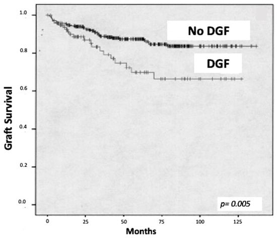 The Kaplan–Meier analysis demonstrated a significantly better survival among patients with immediate graft function compared with patients who developed DGF (p < 0.05) (Figure 1).