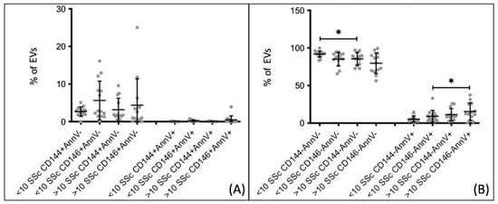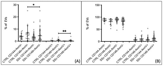 Endothelial and non-endothelial extracellular vesicles percentages comparison between SSc patients and healthy controls. (A) eEV CD146+ populations from apoptotic and non-apoptotic cells are lower in SSc patients than in CTRLs. (B) EVs, both CD144− and CD146−, do not show significant differences. CTRL n = 15, SSc n = 54. * p < 0.05, ** p < 0.005.