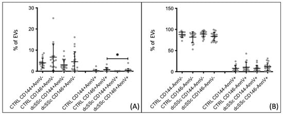 Endothelial and non-endothelial extracellular vesicles percentages comparison between dcSSc patients and healthy controls. (A) eEV CD146+ populations from apoptotic are lower in dcSSc patients than in CTRLs. (B) EVs, both CD144 and CD146, do not show significant differences. CTRL n = 15, dcSSc n = 21. * p < 0.05.