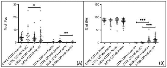 Endothelial and non-endothelial extracellular vesicle percentages comparison between lcSSc patients and healthy controls. (A) eEV CD146+ populations from apoptotic and non-apoptotic cells are lower in lcSSc patients than in CTRLs. (B) EV CD144− and CD146− populations from apoptotic cells are higher in lcSSc patients than in CTRLs. CTRL n = 15, lcSSc n = 33. * p < 0.05, ** p < 0.005, *** p < 0.0005.