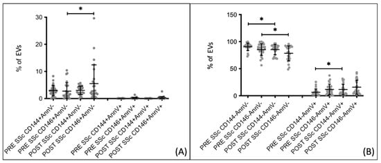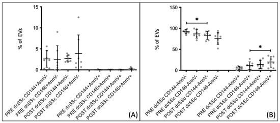 Comparison between percentages of extracellular vesicles before (PRE) and after (POST) Iloprost infusion in dcSSc patients who followed the 1-day infusion therapeutic scheme. (A) eEVs, both CD144+ and CD146+, do not show significant differences. (B) dcSSc patients show a higher percentage of EVs CD144− from non-apoptotic cells before Iloprost infusion, while EVs CD146− from apoptotic cells are higher after infusion. PRE/POST dcSSc n = 7. * p-value < 0.05.