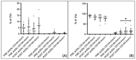 Comparison between percentages of extracellular vesicles before (PRE) and after (POST) Iloprost infusion in dcSSc patients who followed the 5-day infusion therapeutic scheme. (A) eEVs, both CD144+ and CD146+, do not show significant differences. (B) dcSSc patients show a higher percentage of EVs CD146− from apoptotic cells after infusion. PRE/POST dcSSc n = 7. * p-value < 0.05.