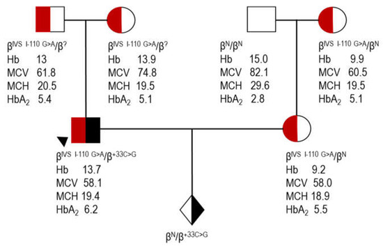 proband (case 7, Table 4); Hb, hemoglobin; MCV, mean corpuscular volume; MCH, mean corpuscular hemoglobin; HbA2, A2 hemoglobin; ?, unknown β allele as a result of direct detection methods utilized for the identification of the most common β variants.