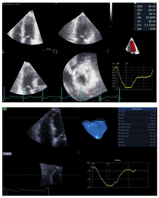 - Vîjîiac, A.; Onciul, S.; Guzu, C.; Verinceanu, V.; Bataila, V.; Deaconu, S.; Scarlatescu, A.; Zamfir, D.; Petre, I.; Onut, R.; et al. The prognostic value of right ventricular longitudinal strain and 3D ejection fraction in patients with dilated cardiomyopathy. Int. J. Cardiovasc. Imaging 2021, 37, 3233–3244. [Google Scholar] [CrossRef]