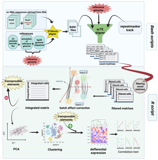 - He, J.; Babarinde, I.A.; Sun, L.; Xu, S.; Chen, R.; Shi, J.; Wei, Y.; Li, Y.; Ma, G.; Zhuang, Q.; et al. Identifying transposable element expression dynamics and heterogeneity during development at the single-cell level with a processing pipeline scTE. Nat. Commun. 2021, 12, 1456. [Google Scholar] [CrossRef]