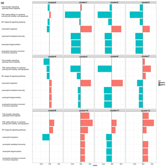As demonstrated in Figures S4–S6 and Tables S6–S8, there is a significant difference in the function of MDSCs and other myeloid cell-type clusters. To facilitate a comparison, we present seven pathways that exhibit greater variation among the first 12 myeloid cell clusters as they represent the major population of myeloid cells. Notably, certain pathways associated with neutrophil function displayed a negative correlation with MDSC function, indicating the suppressive nature of these cells. Conversely, pathways such as Toll receptor signaling, TNF signaling, and NF-kappa B signaling exhibited a positive association with MDSC function (Figure 4).
