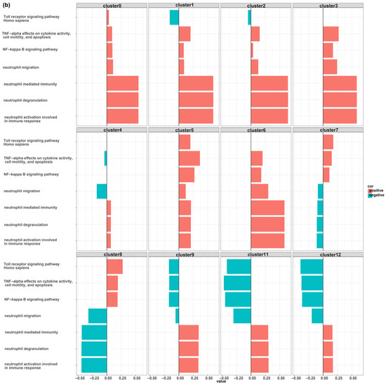 The correlation between seven specific pathways and overexpressed genes in the first 12 myeloid cell clusters from healthy, alive, and dead populations. There is a significant difference in the function of MDSC clusters with highly upregulated TEs compared to other myeloid cell types. MDSC clusters were cluster 11 of healthy samples (a), clusters 7 and 8 of alive patients (b), and cluster 4 of dead patients (c). MDSC clusters showed a negative correlation with neutrophil functions such as degranulation, activation involved in immune response, immunity, and migration. However, some pathways, including the Toll receptor signaling pathway, TNF signaling pathway, and NF-kappa B signaling pathway, were positively associated with the function of MDSCs.