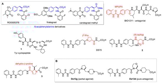Structures of α4β1 integrin antagonists discussed in this paper: (A) N-acylphenylalanine derivatives RO0505376, firategrast, carotegrast-methyl; LDV peptide BIO1211; cyclic peptide 1 containing N-terminal Tyr; peptidomimetics containing a β-residue: DS-70, 2, and 3; (B) peptidomimetics Ds13g (partial agonist) and Ds13d (pure antagonist).