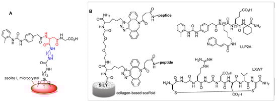 (A) Fluorescent zeolite L microcrystal biofunctionalized with an integrin ligand derived from 2, utilized for coating a leukocyte-responsive nanostructured surface. (B) Collagen-based scaffold functionalized with integrin ligand peptides LLP2A or LXW7; SILY (RRANAALKAGELYKSILY-NH2) is a high-affinity collagen-binding peptide.