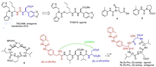 Very recently, Anselmi et al. conceived a minilibrary of stereoisomeric cyclopentapeptides 7 inspired by the structure of BIO1211 (Figure 5). The α4-targeting diphenylurea moiety was mounted onto (S)- or (R)-phenylalanine, giving a phenylalanine–urea residue (Phu). The β-amino acid (S)- or (R)-isoaspartate (isoAsp) were introduced aside the LDV peptide to permit cyclization while conserving a carboxylic group, as at the C-terminus of BIO1211. Receptor affinity and selectivity was ascertained by binding assay on purified integrins, while agonism or antagonism was determined by cell adhesion experiments and by checking intracellular signaling (phosphorylation of ERK1/2 in Jurkat E6.1 cells). Intriguingly, while c[(R)-Phu-LDV-isoAsp] (7c) was a moderate antagonist of both α4 integrins, the all-S configured diasteroisomer c[(S)-Phu-LDV-isoAsp] (7a) was a potent dual agonist of both α4β1 and α4β7 integrin, whereas c[(R)-Phu-LAV-isoAsp] acted as a selective agonist of α4β1 but not of α4β7 integrin, with nanomolar potency [58].