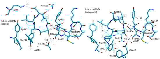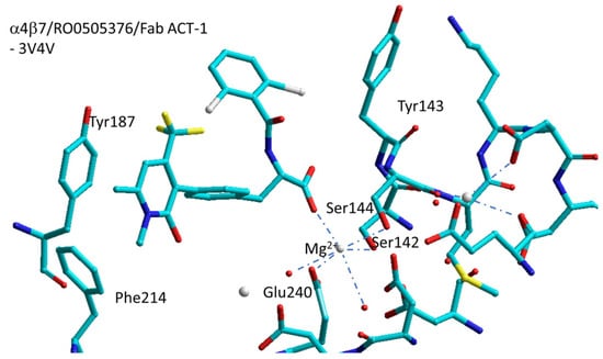 RO0505376 is an antagonist of α4β1 and α4β7 integrin with IC50 values of 32 nM and 42 nM, respectively. The ternary complex formed by α4β7/RO0505376/Fab ACT-1 is contained in 3V4V (Figure 7) [82]. The shape of the binding cleft is clearly dissimilar from that of the RGD-binding integrins. The carboxylate of RO0505376 interacts with the MIDAS cation forming two NH-backbone hydrogen bonds (Tyr143 and Asn235 of β7). The amide NH of the inhibitor forms an H-bond with backbone carbonyl of Asn235 with an orthogonal 2,6-dichlorophenyl moiety in the proximity of the specificity determining loop. The pyridone ring forms π–π stacking with Phe214 and Tyr187 of α4 and an H-bond with Ser238 of β7.
