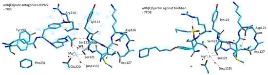 As a result, failed small-molecule inhibitors of integrins αIIbβ3 appear to stabilize the open/high-affinity conformation. The reasons of this behaviour have been investigated by analyzing the crystal structures of the αIIbβ3 headpiece in complex with a variety of ligands, such as the “opening” ligands Roxifiban, Lotrafiban, Tirofiban, and many others, in Mg2+ or Mn2+, in comparison with “closing” ligands such as UR-2922, Gantofiban, etc. During headpiece extension, the key early step is the movement of the β1-α1 loop toward the αIIb subunit. In the absence of a ligand, the sidechain oxygen of Ser123 in the MIDAS motif hydrogen is coordinated to water1. In the subsequent open states, movement of the β1-α1 loop repositions the Ser123 sidechain oxygen to take the place of water1 (Figure 9). Apparently, the pure closing inhibitors might be longer and more rigid than RGD and block this movement.
