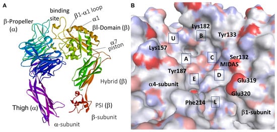 Springer et al. have reported the structures of the headpiece of α4β7 with the antibody natalizumab (4IRZ), or with the antibody Fab ACT-1 (3V4P), or with the small-molecule RO0505376 and Fab ACT-1 (3V4V) [81]. The inspection of the crystal structure of natalizumab (3V4P) with α4β7 revealed that natalizumab binds to the β-propeller of the α4 subunit in a position which is close but alternative to the orthosteric ligand-binding site. In contrast, the ACT-1 antibody binds to the β7 subunit in the proximity the ligand-binding site (3V4P), thus explaining why natalizumab inhibits both α4β1 and α4β7, while ACT-1 only inhibits α4β7.