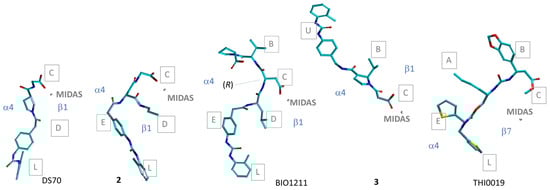 The LDVP peptide BIO1211 (Figure 3) [31] demonstrated a potent antagonist effect against α4β1 integrin. It effectively suppressed antigen-induced airway hyper-responsiveness in allergic sheep [32]. The peptide’s affinity is attributed to the α4-targeting diphenylurea pharmacophore MPUPA. However, the stability of BIO1211 is rather poor, as tested in plasma, heparinized blood, and in homogenates of rat liver, lungs, and intestines [33], and is subjected to rapid clearance in vivo [34].