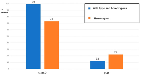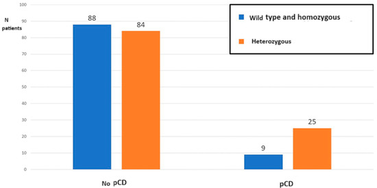 - Calculation of the significance of the association between pCD and the presence of the heterozygous genotype with the chi-squared test and calculation of the p value. The association was considered significant in case of p value < 0.05.