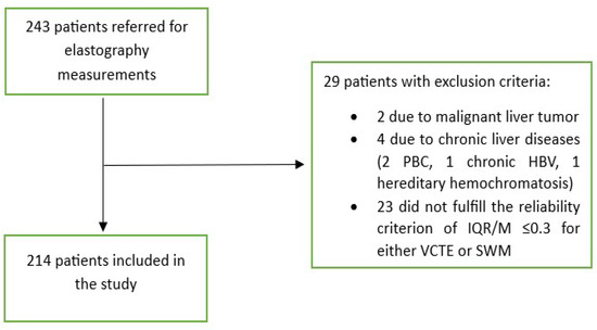 Flowchart of patient selection. Abbreviations as follows: HBV: hepatitis B virus; IQR: interquartile range; M: median; PBC: primary biliary cholangitis; SWM: shear wave measurement; VCTE: vibration-controlled transient elastography.