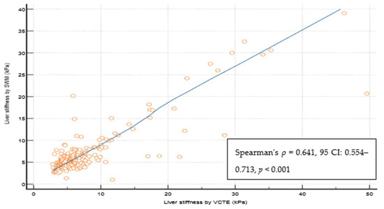Spearman coefficient of the correlation of reliable liver stiffness measurements through VCTE and SWM. Abbreviations: CI: confidence interval; kPa: kilopascals; SWM: shear wave measurement; VCTE: vibration-controlled transient elastography.