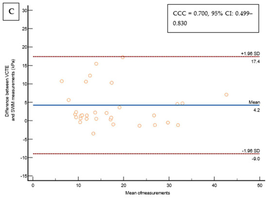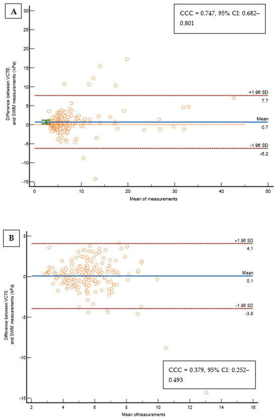 Out of 237 patients, 23 (9,5%) were excluded from the study as they did not fulfill the reliability criterion of IQR/M ≤ 0.3 for either VCTE or SWMs. The final cohort comprised 214 patients with T2D, 112 (52.3%) males, an average age of 66 years, a median body mass index of 30.8 kg/m2, 74 (34.6%) overweight, 122 (57.5%) obese, 165 (78.6%) with arterial hypertension, 159 (75.7%) with dyslipidemia, and 49 (23%) smokers. As for VCTE, the M probe was used for 146 (68.5%) patients, the median LSM measured through VCTE was 5.9 kPa, and the median CAP was 291 dB/m). Seventy-three (34.1%) patients had LSMs that were <5 kPa through VCTE, and a further 108 (50.5%) patients had LSMs in the range of 5–10 kPa in whom cACLD can be ruled out based on Baveno recommendations. In 14 (6.5%) patients, LSMs were in a range between 10 and 15 kPa (suggestive of cACLD), whereas highly suggestive LSMs (>15 kPa) for cACLD were observed in 19 (8.9%) patients. We calculated the FIB-4 score for patients who had LSMs of ≥10 kPa (suggestive of cACLD, N = 33, based on VCTE results). Among them, 4 (12.1%), 15 (45.5%), and 14 (42.4%) patients had FIB-4 scores of <1.3, 1.3–2.67, and >2.67, respectively. The median SWM of the overall cohort of 214 patients was 5.5 kPa, and the median ATT measurement was 0.61 dB/cm/MHz (Table 1). The platelet count and prothrombin time decreased, while the aspartate aminotransferase (AST), alanine aminotransferase (ALT), high density lipoprotein (HDL), FIB-4 score, and APRI score increased with more advanced stages of liver disease (p < 0.05 for all analyses using the Mann–Whitney U test, Table 1). We observed a high correlation (Figure 2) between LSMs that were measured through VCTE and SWMs (Spearman’s ρ = 0.641, 95 CI: 0.554–0.713, p < 0.001)), whereas SWMs produced lower (mean of −0.7 unit, Bland–Altman) LSM values in comparison with VCTE (Figure 3). When analyzing patients with LSMs of < 10 kPa (through VCTE), SWMs produced slightly lower but very close values in comparison with VCTE (mean of – 0.1 unit, Bland–Altman). In patients with higher LSM values measured through VCTE (LSM ≥ 10 kPa), SWMs produced significantly lower values in comparison with VCTE (mean of −4.2 units, Bland–Altman) (Figure 3).