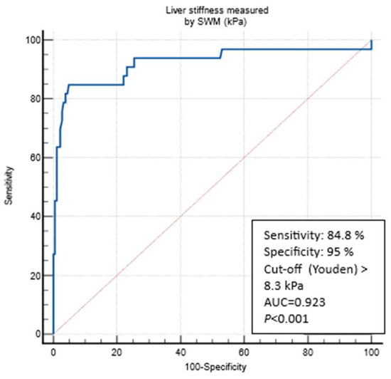 At the LSM cut-off 5.3 kPa (Youden), SWMs had an AUROC of 0.798 to differentiate the patients according to the presence/absence of any fibrosis (defined through the VCTE LSM cut-off of 5 kPa) with a sensitivity of 72.3%, a specificity of 75.3%, a PPV of 85%, a NPV of 58.4%, a +LR of 2.93, and a −LR 0.37). LSM cut-offs through SWMs that were optimized (>90% sensitivity and specificity) for ruling in and ruling out any fibrosis (LSMs of </> 5 kPa through VCTE) were, respectively, ≥6.4 kPa (specif. 90.4%) and ≤4.4 kPa (sens. of 90.1%). The presence of any fibrosis would be missed in 29.7%, 56%, and 9.9% patients using reported the SWM cut-offs (>5.3, ≥6.4, and ≤4.4 kPa, respectively) (Table 2). At the LSM cut-off of 8.3 kPa (Youden), SWMs had an AUROC of 0.923 to differentiate between the patients without and those under suspicion of cACLD (defined using the VCTE LSM of 10 kPa), with a sensitivity of 84.8%, a specificity of 95%, a PPV 75.5%, a NPV 97.2%, a +LR 17.06, and a −LR 0.16) (Figure 4). The LSM cut-off through SWMs that was optimized (>90% sensitivity and specificity) for ruling out cACLD was ≤6.3 kPa (sens. of 90.9%), whereas the SWM value that could rule in the VCTE measurement of ≥10 kPa (suspicion of cACLD) was ≥9.9 kPa (specif. 97.2%). The presence of cACLD would be missed in 15.2%, 27.3%, and 9.1% patients using the reported SWM cut-offs (>8.3, ≥9.9, and ≤6.3 kPa, respectively) (Table 2). At the LSM cut-off of 11.0 kPa (Youden), SWMs had an AUROC of 0.951 to diagnose cACLD (defined as LSMs of ≥15 kPa through VCTE, highly suggestive) with a sensitivity of 84.2%, a specificity of 96.4%, a PPV 69.5%, a NPV 98.4%, a +LR 23.46, and a −LR 0.16. LSM cut-offs through SWMs that were optimized (>90% sensitivity and specificity) for ruling in and ruling out cACLD were, respectively, ≥15.1 kPa (specif. 99.5%) and ≤6.4 kPa (sens. of 94.7%). The presence of cACLD would be missed in 15.8%, 26.3%, and 5.3% patients using reported the SWM cut-offs (>11.0, ≥15.1, and ≤6.4 kPa, respectively) (Table 2). When analyzing the optimal SWM cut-offs in patients with confirmed MASLD (CAP ≥ 274 dB/m, N = 134 patients), we obtained similar results. SWM cut-offs (Youden) corresponding to the VCTE cut-off of 10 kPa were the same as those of the overall cohort (8.3 kPa, AUROC of 0.908, sens. of 85.7%, spec. of 90.2%) and >11.0 kPa for a VCTE measurement of > 15 kPa (highly suggestive of cACLD, AUROC 0.913, sens. of 80%, spec. of 92.6%). The optimized SWM cut-off for ruling out cACLD (LSM of < 10 kPa through VCTE) was ≤6.4 kPa (sens. of 90.5%, spec. of 74.1%), whereas the optimized cut-off for ruling in cACLD (LSMs of > 15 kPa through VCTE) was ≥16.9 kPa (sens. of 60%, spec. of 96.6%) (Table 3). In the multivariate analysis using logistic regression, only platelet count (OR 0.973, 95% CI 0.948–0.998, p = 0.04), AST (OR 1.195, 95% CI 1.026–1.392, p = 0.02), and LSMs that were measured through VCTE (OR 1.376, 95% CI 1.160–1.632, p < 0.001) were independently and significantly associated with the SWM value (8.3 kPa), thereby indicating a suspicion of cACLD (Supplementary Table S1). On the other hand, in multivariate analysis, which only used logistic regression LSMs that were measured through VCTE (OR 1.371, 95% CI 1.151–1.633, p< 0.001), was independently and significantly associated with the SWM value (11 kPa) that was highly suggestive of cACLD (Supplementary Table S2).