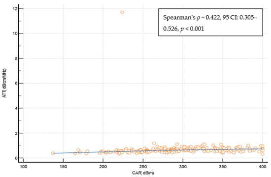 Spearman’s coefficient of correlation between the CAP and the ATT measurement. Abbreviations: ATT: attenuation measurement; CAP: controlled attenuation parameter; CI: confidence interval; dB/cm/MHz: decibel per centimeter per megahertz; dB/m: decibel per meter.