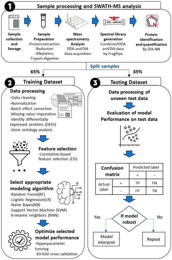 The samples were analyzed using SWATH-MS in four distinct batches with four replicated samples in batches for the batch effect diagnosis. Initially, we used batches 1–3 including 78 samples for the retrospective analysis and model training, while keeping aside batch 4 with 45 samples as a prospective blind testing group. For accurate peptide identification, we utilized the combined library (DDA and DIA) in conjunction with MBR (match between runs) within the DIA-NN software. The DIA-NN software employs collections of deep neural networks to enhance the ability to match DIA fragmentation patterns with spectral libraries, thereby improving sensitivity [29]. Moreover, enabling the match between runs (MBR) parameter led to an increase in the average number of identified entities and significantly improved data completeness by reducing the occurrence of missing values (https://github.com/vdemichev/DiaNN, accessed on 15 May 2022). An estimated 1250 proteins and 9000 peptides were identified and quantified.