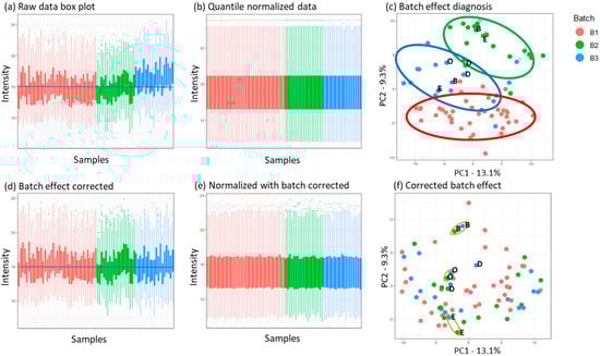 Identification and correction of the batch effect. (a) Box plot illustrating the protein distribution in the unprocessed log-transformed data format across three sample batches. (b) Box plot displaying the quantile normalized data. (c) PCA analysis of the normalized data, revealing clear clustering due to batch effects. (d) Box plot representing the influence of the ComBat batch effect correction on the initial data. (e) Box plot of data after batch correction of normalized data. (f) PCA analysis indicating the successful elimination of batch effects by the close representation of the replicated samples in different batches. The letters in panels (c,f) illustrate the replicated samples in different batches, which are expected to be seen in close proximity to each other. This expectation is fulfilled after batch correction.