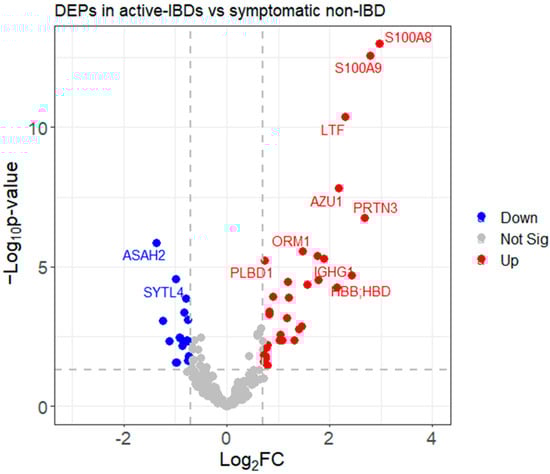 The volcano plot summarizes differentially expressed proteins (DEPs) detected in samples obtained from active IBD patients and symptomatic non-IBD patients. Among the approximately 300 proteins detected as being consistently present in samples obtained from IBD patients, 48 were initially identified either as reduced (blue dots) or increased (red dots). Group comparisons between active IBD patients and symptomatic non-IBD patients were calculated using Welch’s t-test with a Log2(FC)| ≥ 0.70 and p-value ≥ 1.3 in ProStar.