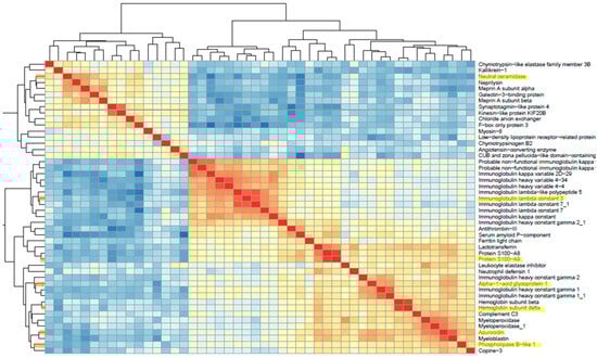 To construct a predictive model, it is essential to select relevant features while removing redundant and irrelevant ones through feature selection. This process reduces data dimensionality, improves model performance, and reduces overfitting. In this study, “features” refer to the “proteins”, and we aimed to reach a reasonable number of proteins as biomarkers. Two common classic feature selection models are the filter and wrapper methods. The main difference between them is that a filter model selects features based on intrinsic data properties, while a wrapper model involves a learning algorithm in determining feature quality [51]. To identify the most relevant features among the 48 DEPs, we assessed five well-known feature selection methods, including correlation-based feature selection (Cfs), Boruta, information gain, gain ratio, and the wrapper method in WEKA software. Among these methods, the Cfs method demonstrated superior prediction performance compared to the others. Cfs is a filter-based feature selection method that chooses features based on their maximum correlation with the class variable and minimum intercorrelation [52]. As feature reduction offers several benefits, including speeding up algorithm processing time, improving data quality, enhancing algorithm predictive power, and making results more understandable, we aimed to investigate whether we could reduce these 16 proteins without compromising classification performance [33]. To refine our selection, we excluded proteins with less attribute weight, resulting in the elimination of five that had minimal impact on classification performance. Seeking further optimization, we assessed protein–protein correlations among the remaining 11 proteins and removed the ones with a high intercorrelation and lower weight attribute. This iterative process led to a reduction in the number of proteins to seven. Figure 5 illustrates the correlation heatmap among proteins, with the selected ones highlighted. This visualization demonstrates that the selected proteins are primarily chosen from distinct clusters, confirming their low intercorrelation.