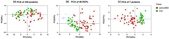 Unsupervised group classification via principal component analysis (PCA) across three datasets: (a) the original dataset comprising 250 proteins, (b) the dataset following the DEP analysis of 48 proteins, and (c) the dataset featuring the seven proteins selected through the feature selection process.