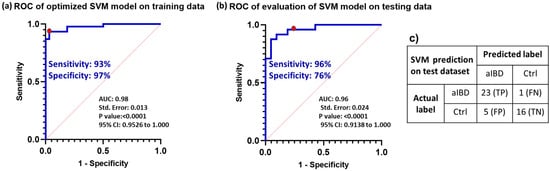 (a) The ROC curve analysis involved applying an optimized SVM model to the training dataset to determine the threshold, resulting in 93% sensitivity and 97% specificity as indicated by the red dot. (b) In the ROC curve analysis of the model applied to the testing dataset, we obtained an AUC of 0.96. Using a previously selected threshold, the model achieved 96% sensitivity and 76% specificity (red dot). (c) The confusion matrix displays the counts of true positives (TP), false positives (FP), true negatives (TN), and false negatives (FN). The results highlight the high accuracy and exceptional performance of the generated model in accurately classifying the blind data.
