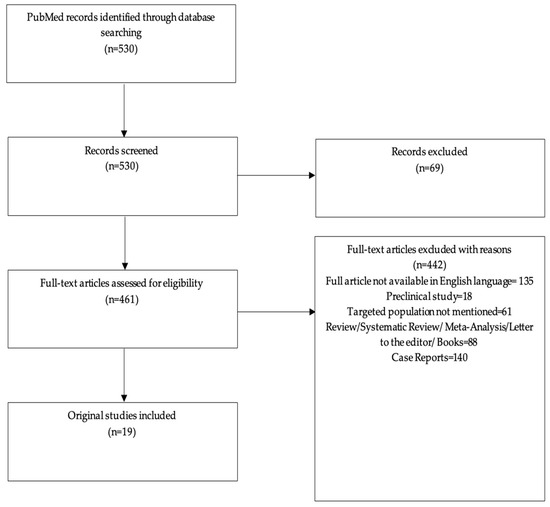 This paper is a comprehensive review of the literature published in English from inception to October 2023. For this purpose, a comprehensive search was conducted on the PubMed database (www.pubmed.gov), accessed on 14 October 2023, utilizing two specific keywords: “necrobiosis lipoidica” and “diabetes”. We identified a total of 530 studies, which were subsequently searched manually to meet our study’s goals. Additionally, we excluded animal studies, studies with poor methodology, case reports, meta-analyses, and reviews. The selection process resulted in a total of 19 human studies that were clinically significant and novel, featuring a range of statistical support at different levels. The included articles were evaluated for relevant cross-references. A PRISMA flow diagram was created in order to summarize the screening process visually (Figure 1).