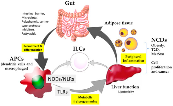 Previous research has largely focused on total calorie intake and an adequate nutrient intake so as to develop proper immune system response(s) [9]. NCDs share common features, such as liver dysfunction and tissue inflammation, where the monocyte/macrophage population has multifaceted effects [10,11]. Recent findings also provided new insights into how innate and adaptive lymphocytes operate sequentially and in distinct ways during normal development to establish steady-state commensalism and lipid homeostasis [12]. Studies on the intricate relationship between the maturation of the intestinal immune system and the induction of obesity revealed that innate lymphoid cells (group 2)—ILC2s—are determinants in the induction of diet-induced obesity [13]. Later research demonstrated that liver macrophages are determinants in the diet-regulated control of hepatic fat accumulation [14]. In this sense, recent data evidence that dietary nutrients able to promote beneficial immune response(s)—immunonutritional agonists—can be even more important determinants of intestinal, liver, metabolic, and cardiovascular health [15]. These effects appear to be derived from a selective functional differentiation of the monocyte/macrophage population towards an M1-like phenotype [15]. In addition, recent research also associated the expansion of ILC2 and ILC3 populations with a reduction in the accumulation of fats into the liver [16].