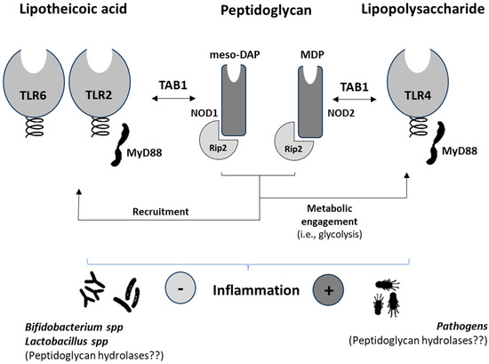 The scientific literature reveals scarce information from patients concerning the involvement of specific NODs in NCDs [57,58]. NOD1/2 were shown to be up-regulated (mRNA) in monocytes from patients with T2D. This result allows us to hypothesize that nutrient utilization by monocytes is going to be affected in such a way that insulin resistance is increased thereby signaling events that promote an inflammatory phenotype [59]. Synergistic effects between NOD-like receptors (NLRs) and TLRs in human B lymphocytes [60] have been reported. Thus, immunometabolic adaptations in the myeloid population promote a cascade of events involving adaptive T-cells [61] leading to increased, ultimately aberrant and uncontrolled, inflammatory processes. In obese individuals, it was shown that NLRP3 activation could be attenuated by acutely raising the plasmatic concentration of β-hydroxybutyrate with the ingestion of exogenous ketones [58]. This effect was reflected in the decreased production of plasmatic IL-1β. Together with IL-1α, these cytokines significantly contribute to the promotion of insulin resistance impairing the function of adipocytes in promoting inflammation. In addition to low-grade inflammation, NCDs [62] share other features such as imbalances in the composition of the gut microbiota, which have also been associated with cancer [63]. In this sense, patients suffering from intestinal metaplasia display a modified cluster of microbes after H. pylori eradication [64]. Despite the abundance of pathogenic bacteria and the presence of oral microbes enabling the production of peptidoglycan(s), decreased NOD-like signaling was found. This effect appears to contrast with that expected from the endotoxin-like properties of the peptidoglycan(s) from pathogens. The microbial cluster of these patients was composed of, among others, members of the Prevotella, Rothia, and Granulicatella genera, which could represent a good source of butyrate-producing bacteria [65,66]. It is worth noting the butyrate-induced effects limiting natural killer (NK) cell function [67], which could allow hypothesizing this effect to explain, at least in part, the reported data on patients suffering intestinal metaplasia. It is known that NK cells play a dual role, and in cases of immune evasion even help promote metastases [68]. This hypothesis could also be supported by the anti-inflammatory effects derived from probiotic administration. Despite the widespread use of probiotics, most of which include the Bifidobacterium and Lactobacillus genera producing peptidoglycans, there is scarce information from controlled trials concerning their direct association either with the expression or modulation of NODs and NOD-like receptors (NLRs). In this regard, we can hypothesize that the production of peptidoglycan hydrolases by these genera could present a different activity than those produced by Gram (−) bacteria. Thus, despite the generation of ligands for NOD2 by Gram (+) bacteria [69], the signaling of this receptor results in effects that may not synergize with TLRs, which would partly explain the absence of inflammatory effects (Figure 2). Otherwise, a significant bulk of scientific reports exists confirming that cytokine production and innate immune as well as adaptive cells are modulated by lactobacilli and bifidobacteria resulting in improved regulatory immune responses [70].