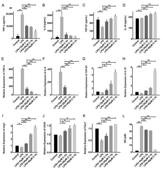 Therefore, concentrations lower than the IC20 of chensinin-1b were selected and used for subsequent experiments. We constructed a model of macrophage M1 polarization via LPS treatment of RAW 264.7 cells to analyze the impact of chensinin-1b on M1-polarized macrophages. The levels of M1/M2-associated cytokines and genes were detected in LPS-activated macrophages treated with or without chensinin-1b by ELISA, Griess assays, and RT-PCR (Figure 1). In comparison to the control group, LPS stimulation increased the production of NO and the expression of the proinflammatory cytokines TNF-α and IL-1β. Chensinin-1b treatment suppressed the expression of M1-associated cytokines and mediators stimulated by LPS in a dose-dependent manner.