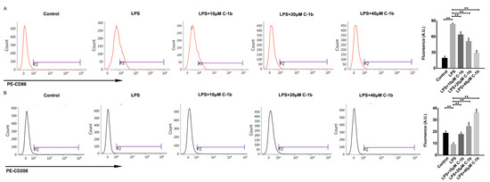 RAW 264.7 cells or peritoneal macrophages were harvested and rinsed with 2% BSA/PBS. Following the cleansing process, the cells were stained for 30 min at a temperature of 37 °C. The staining involved the use of PE-conjugated anti-mouse CD86 or CD206. To establish a baseline for comparison, PE-conjugated rat IgG2a, κ (Biolegend, San Diego, CA, USA) was employed as an isotype control. Stained cells were analyzed using a BD FACSVerseTM flow cytometer (BD Biosciences, Franklin Lakes, NJ, USA), and fluorescence intensities were determined using the FlowJoTM v10.0.7 software.