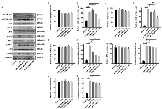 Chensinin-1b suppressed the NF-κB and MAPK pathways in LPS-stimulated RAW 264.7 cells (A–K). Cells were subjected to treatment with chensinin-1b (0, 10, 20, or 40 μM) with the presence of 1 μg/mL LPS for 24 h. Western Blot analysis was performed to assess the protein expression of NF-κB p65, phospho-NF-κB p65, I-κB, phospho-I-κB, JNK, phospho-JNK, ERK, phospho-ERK, p38, and phospho-p38. Data represent the mean ± SEM (n = 3), with * p < 0.05 and ** p < 0.01.