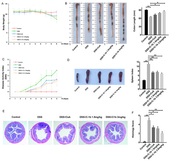After 4 days of acclimation, the mice were divided into 5 experimental groups (each comprising 5 individuals) in a random manner: normal control, colitis control, cyclosporin A (CsA)-treated (25 mg/kg), low-dose chensinin-1b-treated (1.5 mg/kg), and high-dose chensinin-1b-treated (3 mg/kg). The mice in the normal control group received plain drinking water, contrasting with the other groups, which received DSS-containing water (4%, w/v) for a duration of 7 days to induce acute colitis. The treated mice received daily intraperitoneal injections of CsA or chensinin-1b from day 1 to day 9, whereas the control group was injected with saline. Based on established protocols, the disease activity index (DAI) was calculated daily, consisting of assessments of body weight fluctuations and stool consistency as well as instances of rectal bleeding [58]. On day 9, mice were humanely euthanized via cervical dislocation under isoflurane to collect serum, peritoneal macrophages, the colon, and the spleen for further studies. Colon length and spleen weight were recorded.