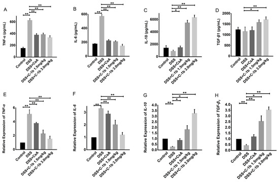 The treatment of chensinin-1b regulated the expression of pro- and anti-inflammatory cytokines in mice with DSS-induced colitis. Serum levels of the cytokines TNF-α, IL-6, IL-10, and TGF-β1 (A–D) are shown. The mRNA expression of cytokines, including TNF-α, IL-6, IL-10, and TGF-β1, in colon tissue (E–H) is shown. Data represent the mean ± SEM (n = 5 mice per group), with * p < 0.05 and ** p < 0.01.