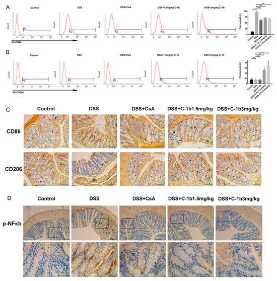 The expression levels and distribution of CD86, CD206, and NF-κB p65 in colon tissue were visualized via immunohistochemical analysis. After the dewaxing rehydration step as mentioned above, sections were probed overnight at 4 °C with the primary antibodies, targeting CD86, CD206, and phospho-NF-κB p65 (all at a dilution of 1:1000) sourced from Cell Signaling Technology. The second antibody (ZSGB-BIO, Beijing, China) was applied and incubated at 37 °C. The Olympus CKX41 microscope (Tokyo, Japan) was utilized for photography.
