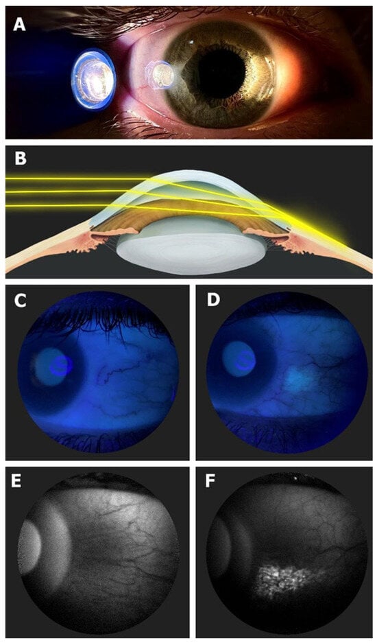 (A) In vivo demonstration of corneal focusing of peripheral light coming from the temporal side of the eye onto the limbus and nasal conjunctiva with higher light intensity compared to the temporal side. (B) Optical representation of the peripheral light-focusing effect that leads to a concentration of the incoming rays of light, passing through the anterior chamber, onto the contralateral limbo-conjunctival surface of the eye. (C) CUVAF negative (no conjunctival hyperautofluorescent area is seen) in a color photograph taken under UV light (peak wavelength of 365 nm). (D) CUVAF positive (demonstrates an area of hyperautofluorescence in the right nasal interpalpebral region) in a color photograph taken under UV light (peak wavelength of 365 nm). (E) CUVAF negative (no conjunctival hyperautofluorescent area is seen) in a photograph taken using the BAF mode of the Heidelberg Spectralis HRA + OCT (peak wavelength of 488 nm). (F) CUVAF positive (demonstrates a triangular conjunctival hyperautofluorescent area with limbal base and temporal apex) in a photograph taken using the BAF mode of the Heidelberg Spectralis HRA + OCT (peak wavelength of 488 nm). Image courtesy of Gutierrez-Rodriguez et al [].