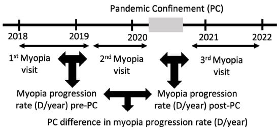 A retrospective observational study was carried out using a cohort of children (6–17 years old), and two other cohorts of adults. The progression of myopia during the same period was compared to that of young adults (18–25 years old) and middle-aged adults (>40 years old) with some degree of myopia (<−0.75 diopters). The project was approved by the Institutional Review Board and the Ethics Committee of the Clínica Universidad de Navarra (study code 2021.070). All procedures carried out conformed to the guidelines of the Declaration of Helsinki. All the subjects that were included in the study were fully informed of the purpose and procedures of the study and informed consent was obtained for all participants.